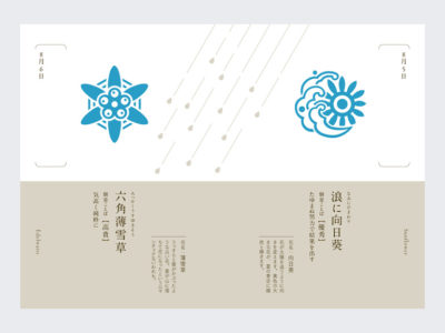 家紋は、日本文化の歴史と美の象徴。折々に咲く花は、日本人の繊細な四季感覚をあらわします。「花個紋」とは、伝統的な家紋の意匠に習い、四季折々の花をモチーフに新しく編まれた花暦です。花が開くは運気が開く。1日1日の花は、その日を祝福しています。誕生日、記念日など、あなたにとっての大切な日を書きとめてください。花個紋にこめられたメッセージをあなたに贈ります。