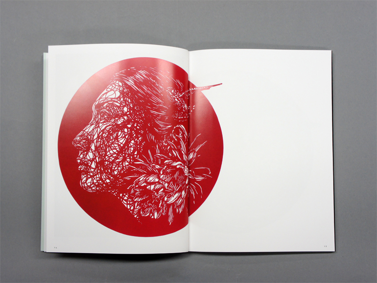 従来の切り絵とは一線を画す「KIRIGA(切り画)」と名付けられたグラフィカルで現代的な感覚を持つ作品群は、喜びや哀しみ、激しい怒りや諦観など、人の相貌、野性動物など、美しい生が、力強く、しなやかに刻み込まれています。