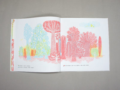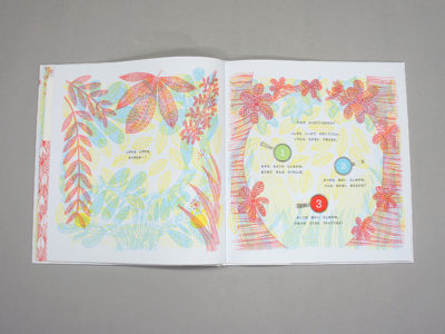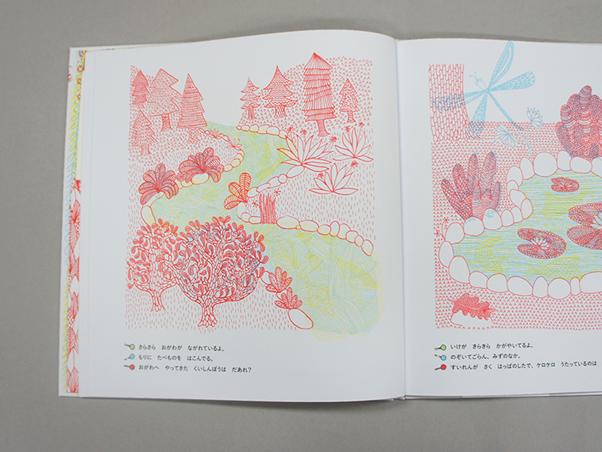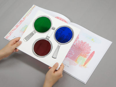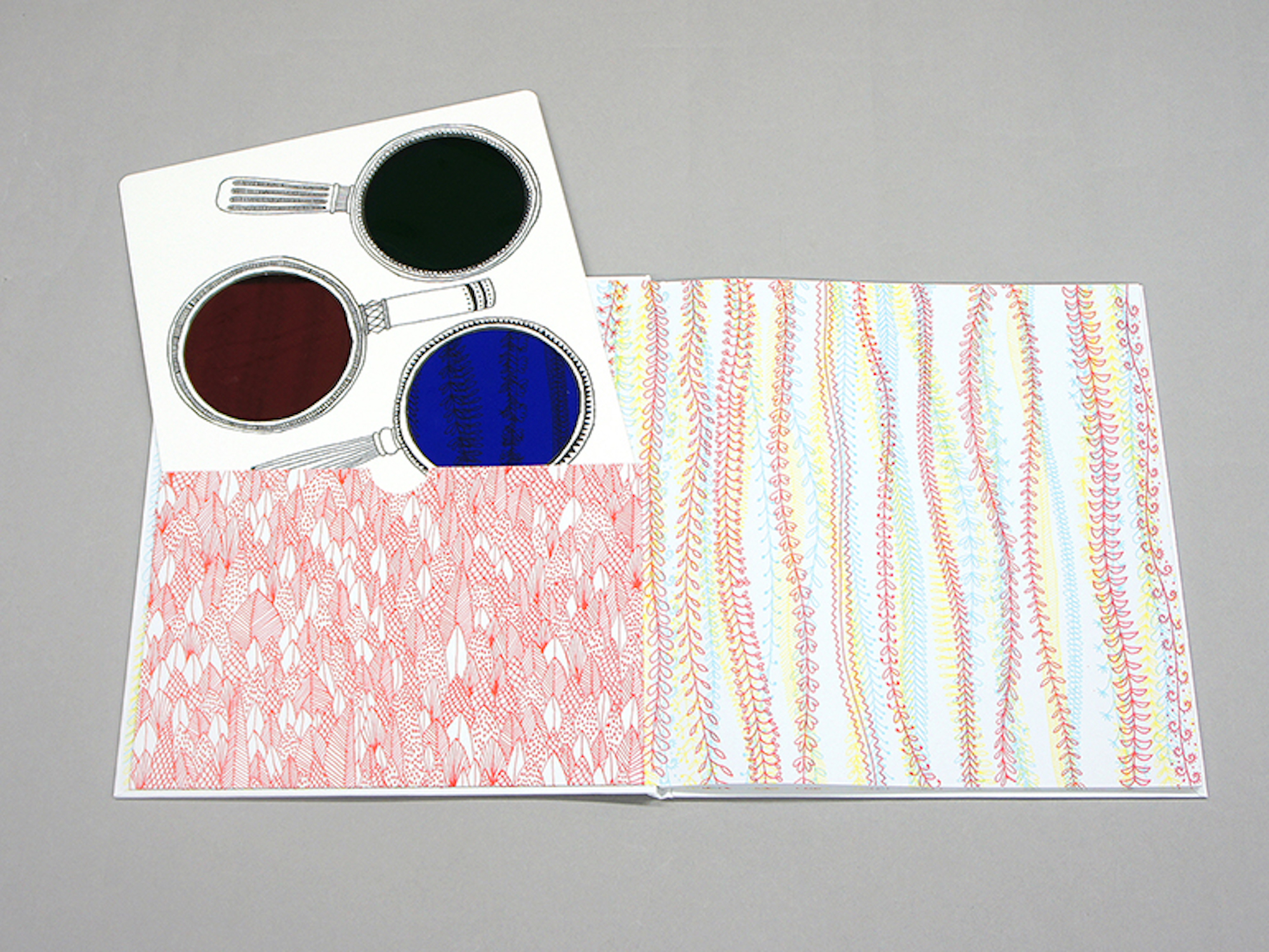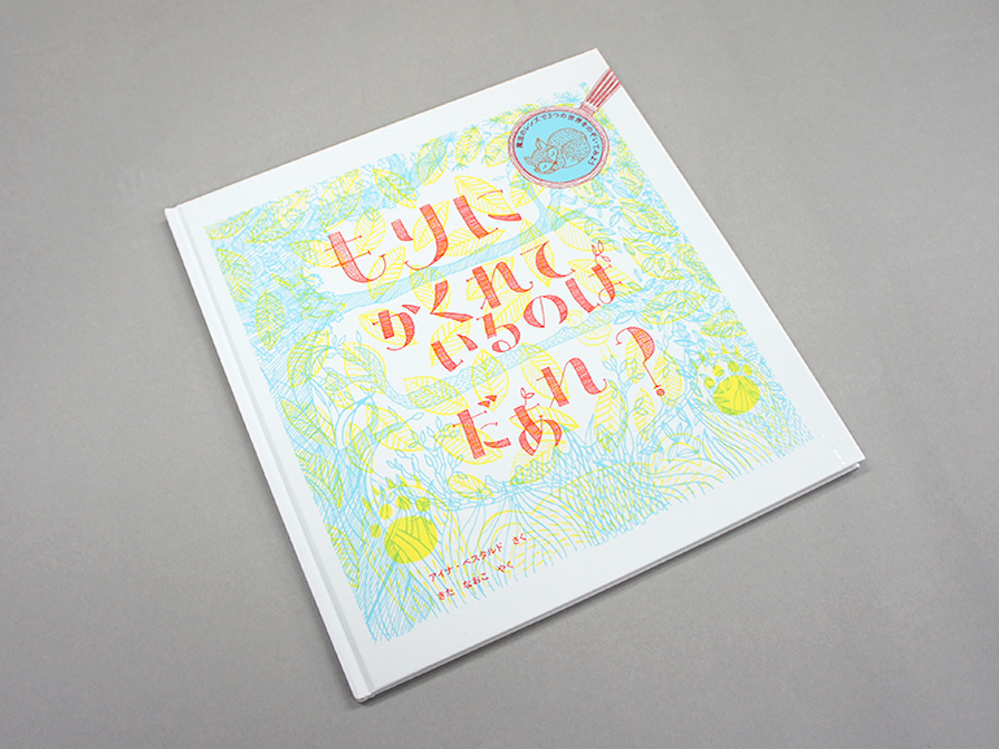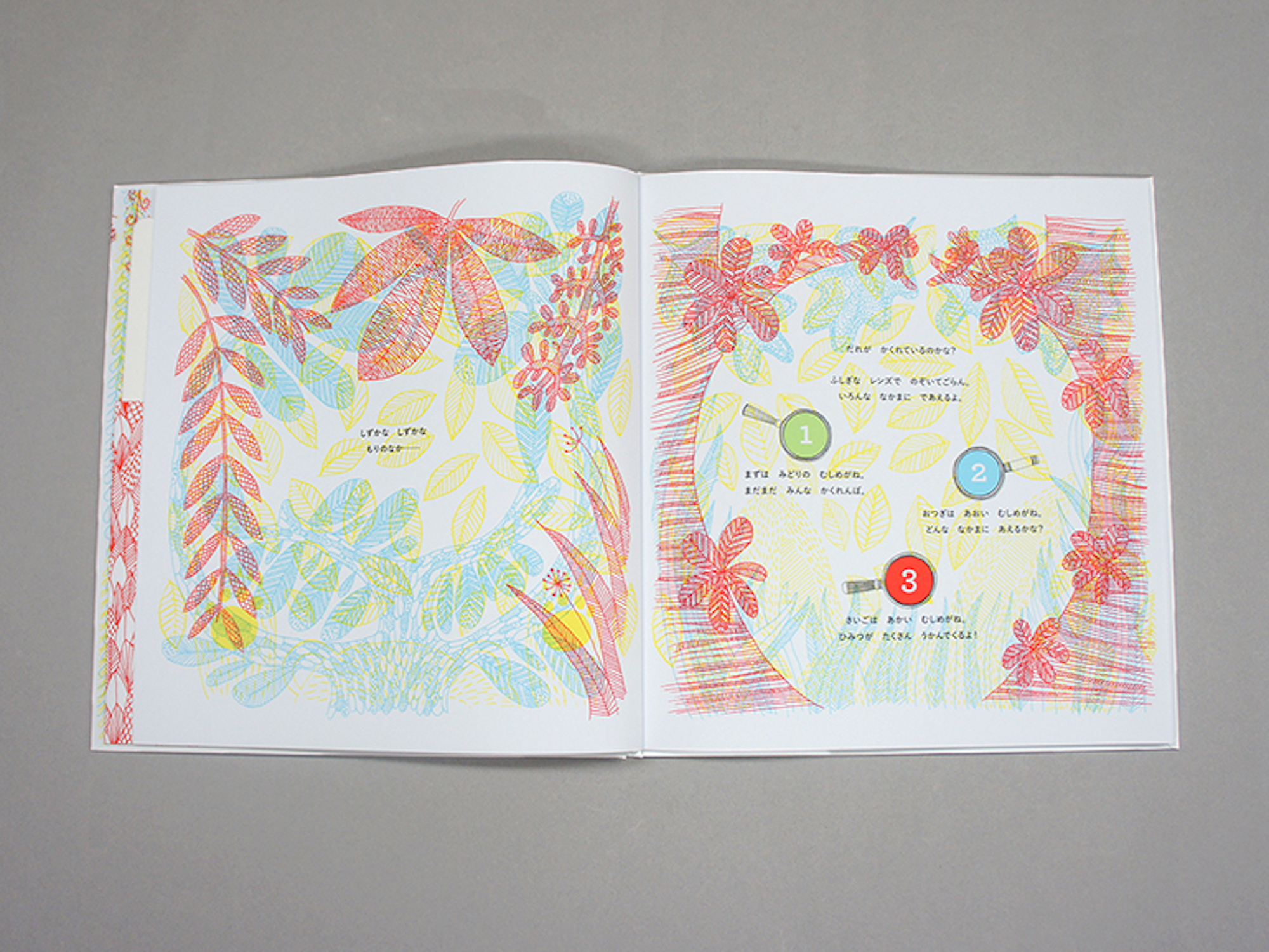 幻想的な線画で描かれた森の中を緑・青・赤の魔法のレンズでのぞいてみると、かわいい動物たちがかくれんぼしています。