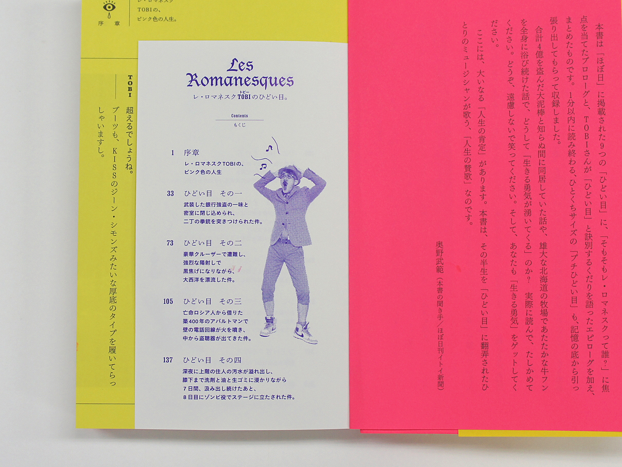 ポップデュオ「レ・ロマネスク」のボーカルTOBI(トビー)氏がこれまでの人生において幾度となく遭遇した、ちょっと考えられないような「ひどい目」のエピソードを、書籍オリジナルのコンテンツを加えて書籍化。本当に「ひどい」エピソードにも関わらず、TOBI氏の語り口の軽妙さから、笑っちゃいけないと思いながら大笑いしてしまう、読むと元気が出る本。