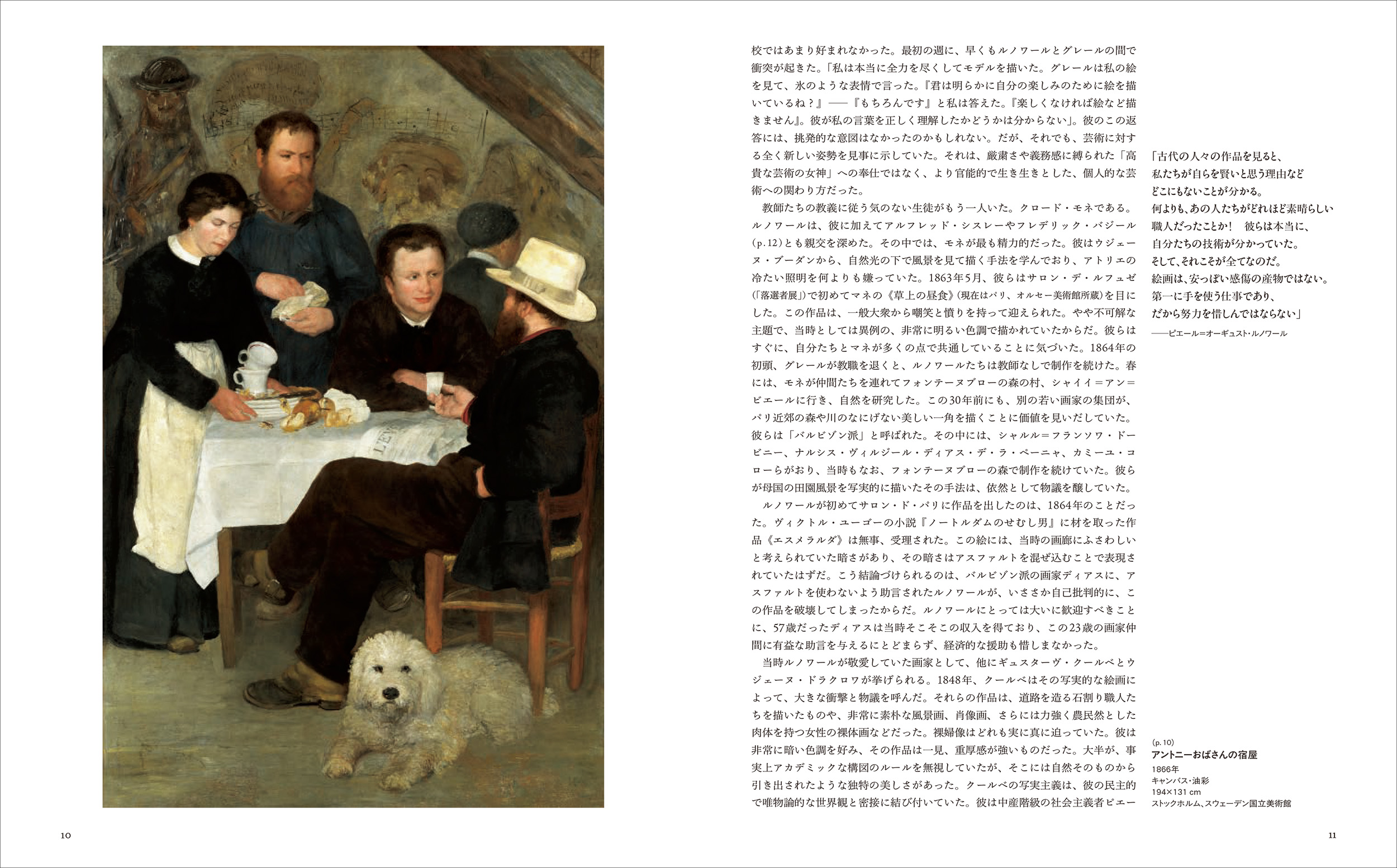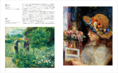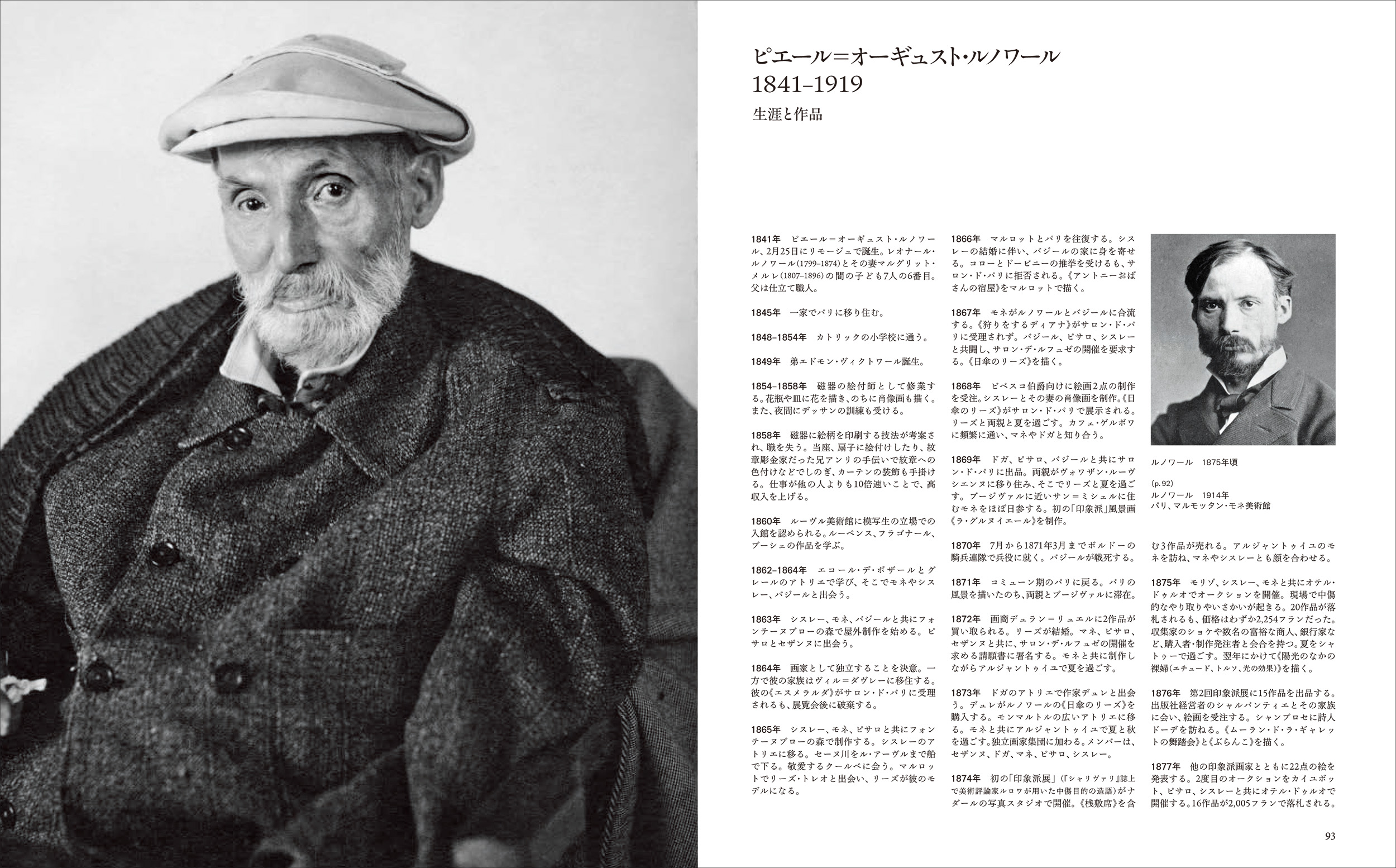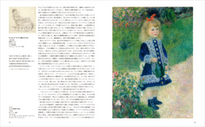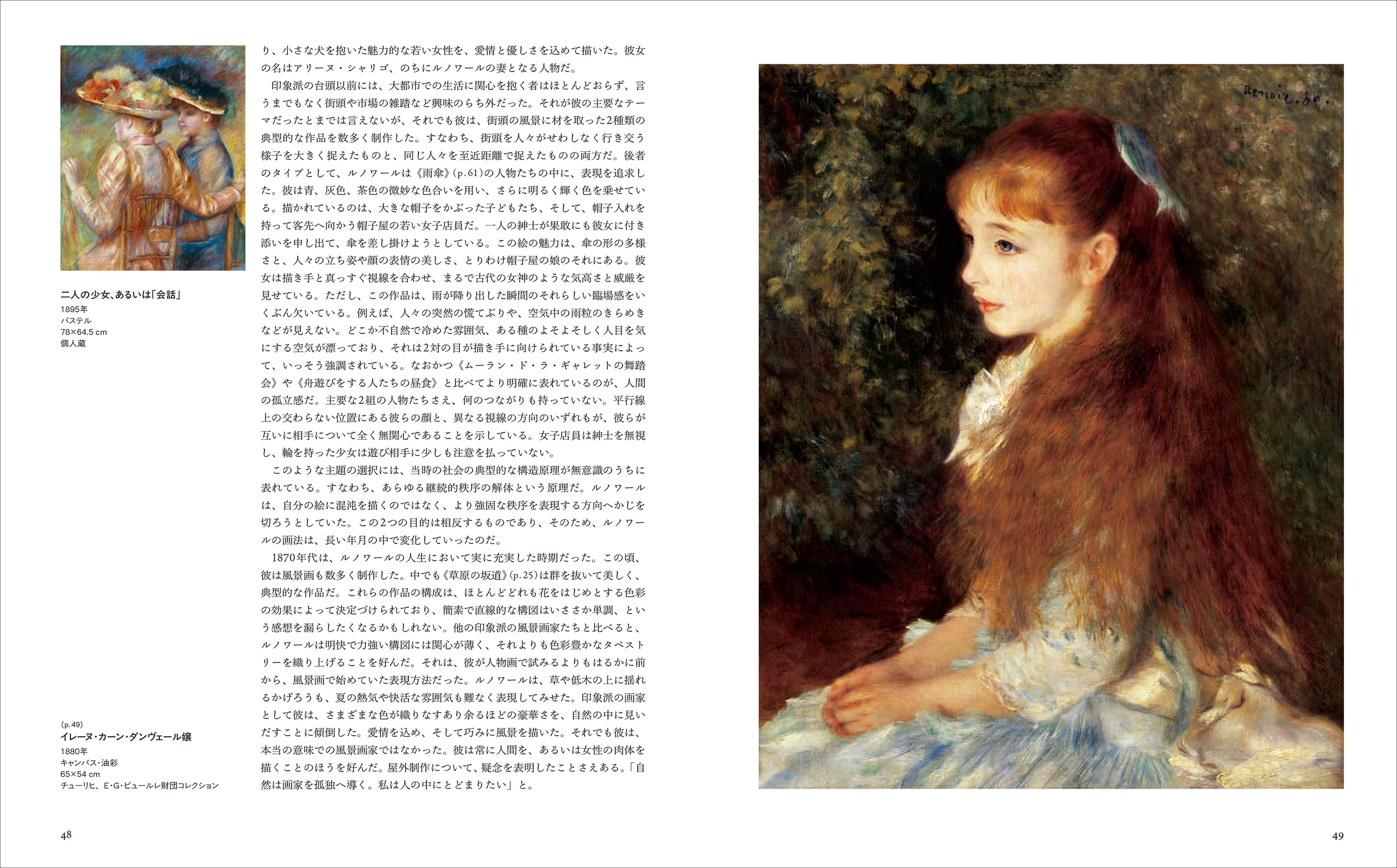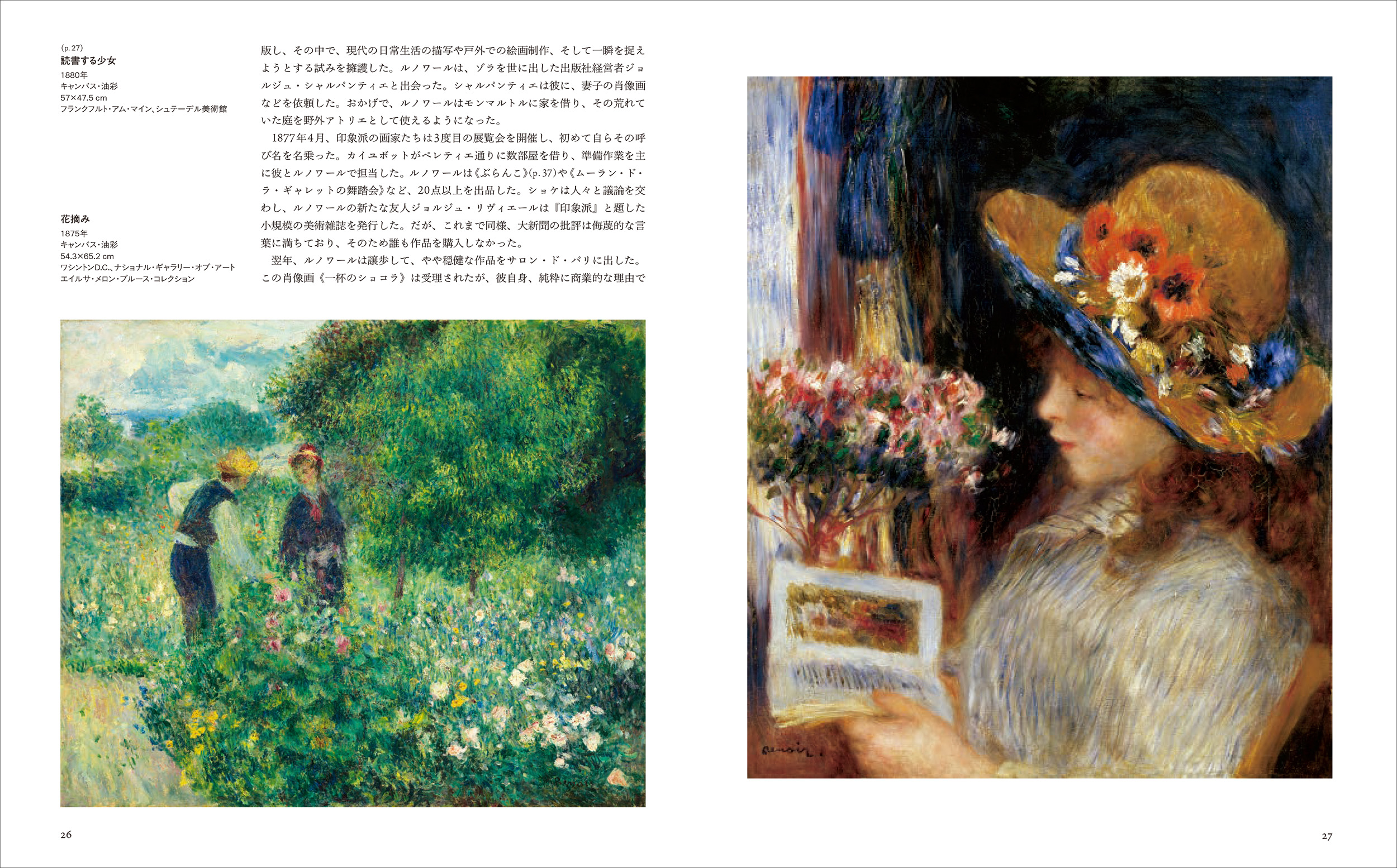 『アントニーおばさんの宿屋』(1866年)、『日傘のリーズ』(1867年)、『プロムナード』(1870年)、『読書する少女』(1880年)、『じょうろを持つ少女』(1876年)、『ムーラン・ド・ギャレットの舞踏会』(1876年)、『シャルパンティエ夫人と子どもたち』(1878年)、『イレーヌ・カーン・ダンヴェール嬢』(1880年)、『ピアノを弾く少女たち』(1892年)など、名作77作に加え、巻末にはルノワールの生涯を示す詳細年表を掲載。