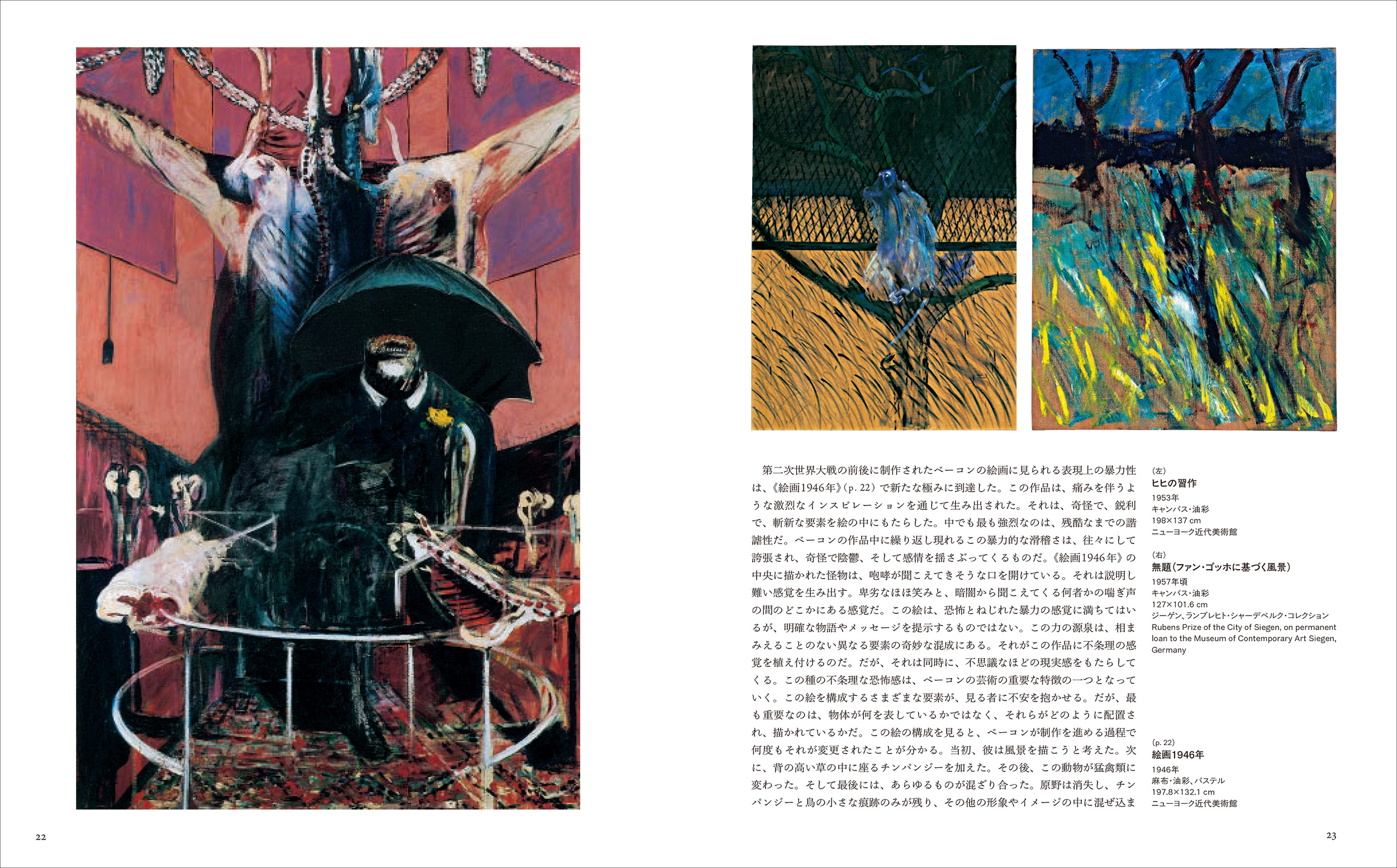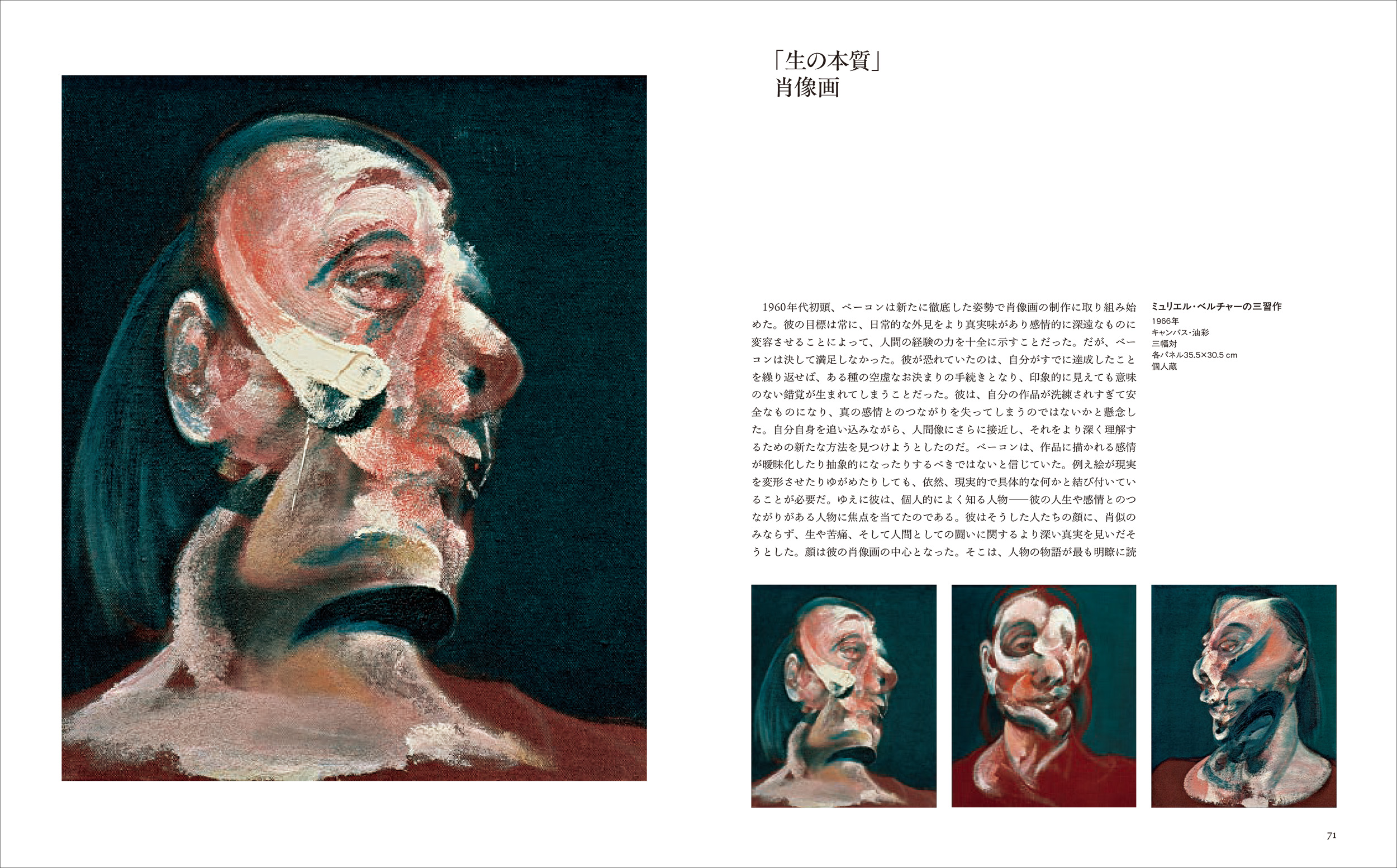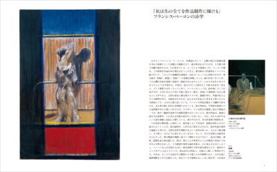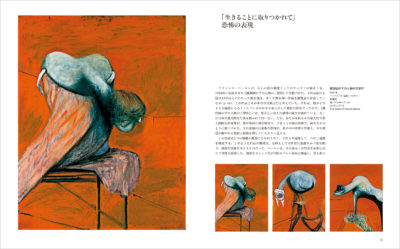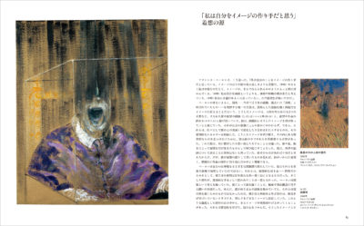 『絵画1946年』(1946年)、『ベラスケスの教皇インノケンティウス10世の肖像に基づく習作』(1953年)、『トリプティック1974年3月』(1974年)、『ベラスケスに基づく習作』(1950年)、『横たわる女』(1961年)、『自画像』(1956年)、『磔刑図の断片』(1950年)、『ミュリエル•ベルチャー嬢』(1959年)、『砂丘』(1983年)など、名作・衝撃作78作に加え、巻末にはベーコンの生涯と作品を示す詳細年表を掲載。