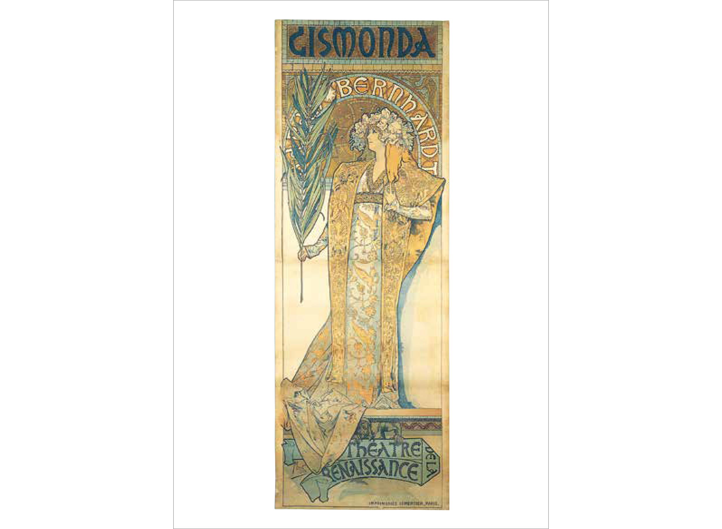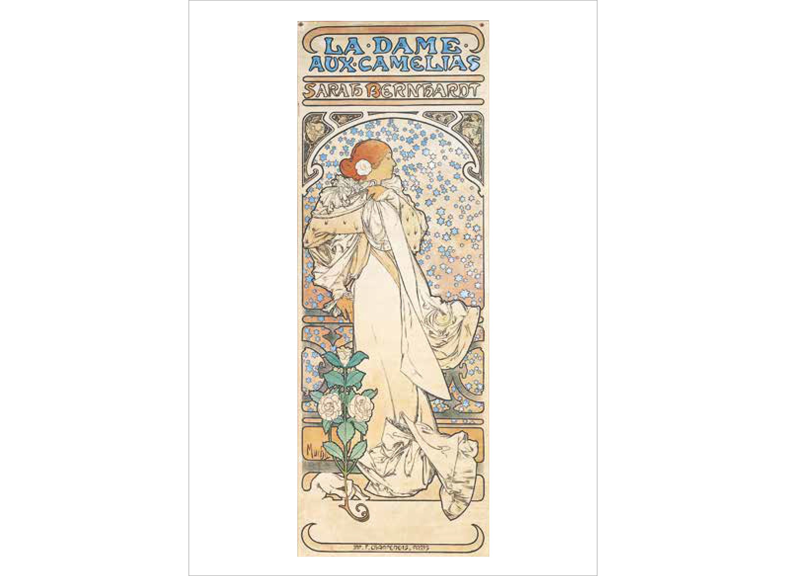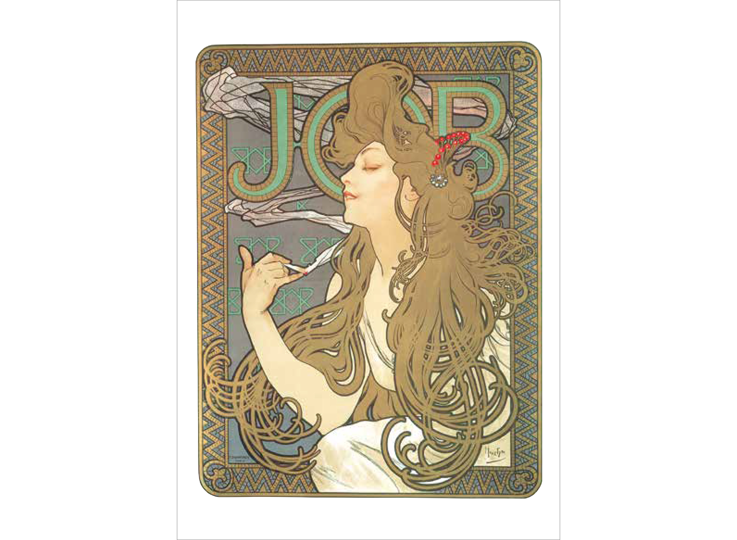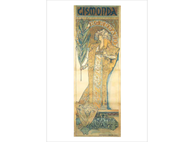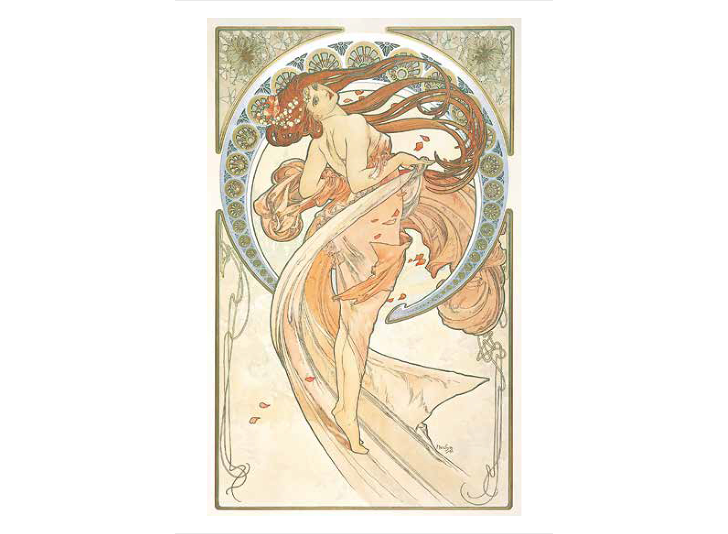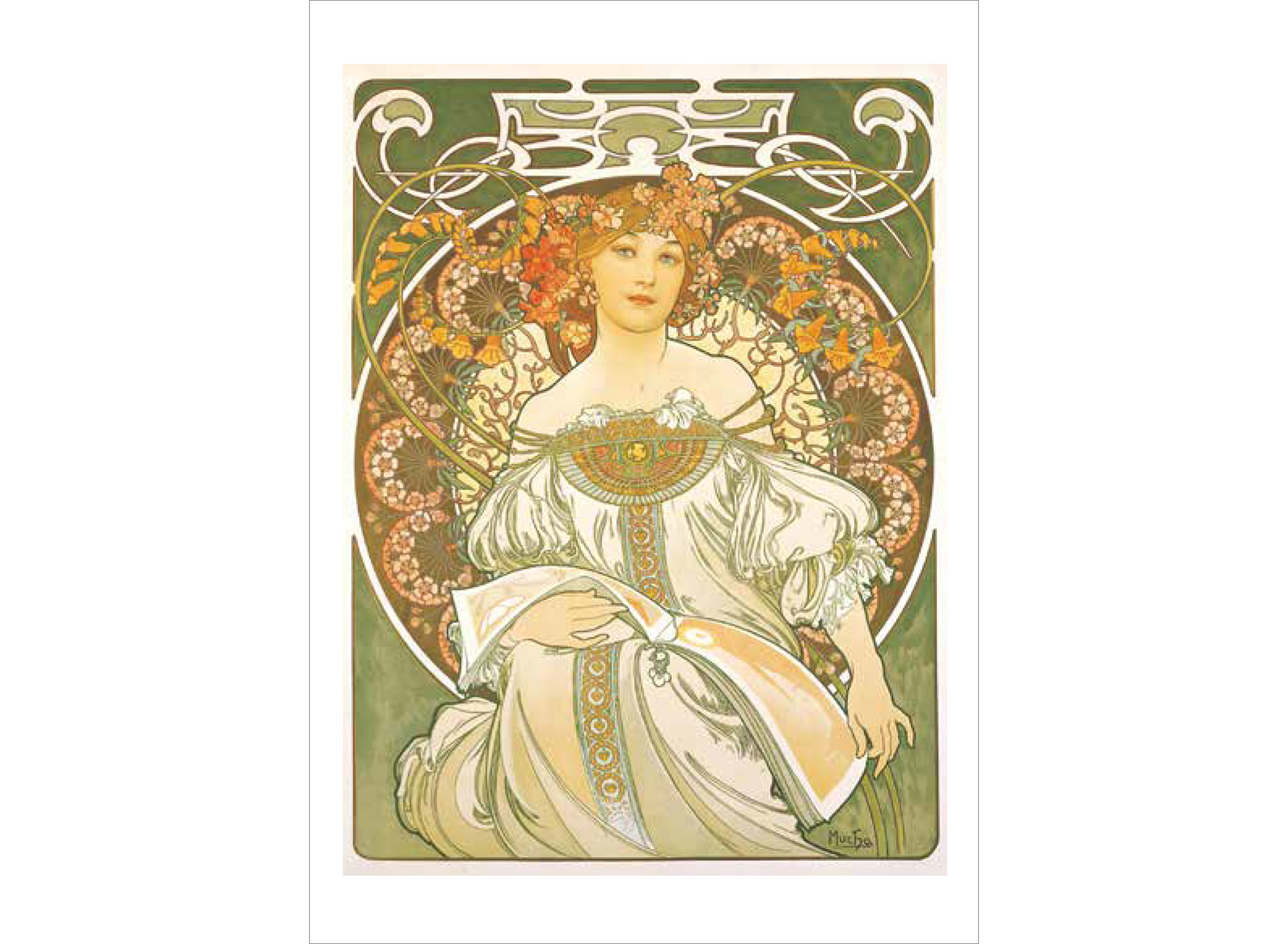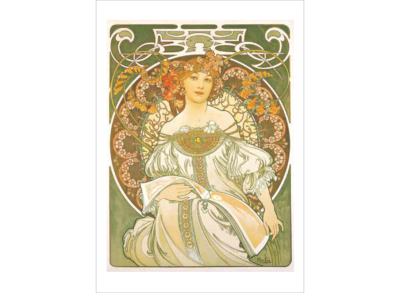 ミュシャは絵画でつちかった的確なデッサンによる女性像を基本に、幾何学文様、様式化された花、髪の毛、衣装などで飾った。