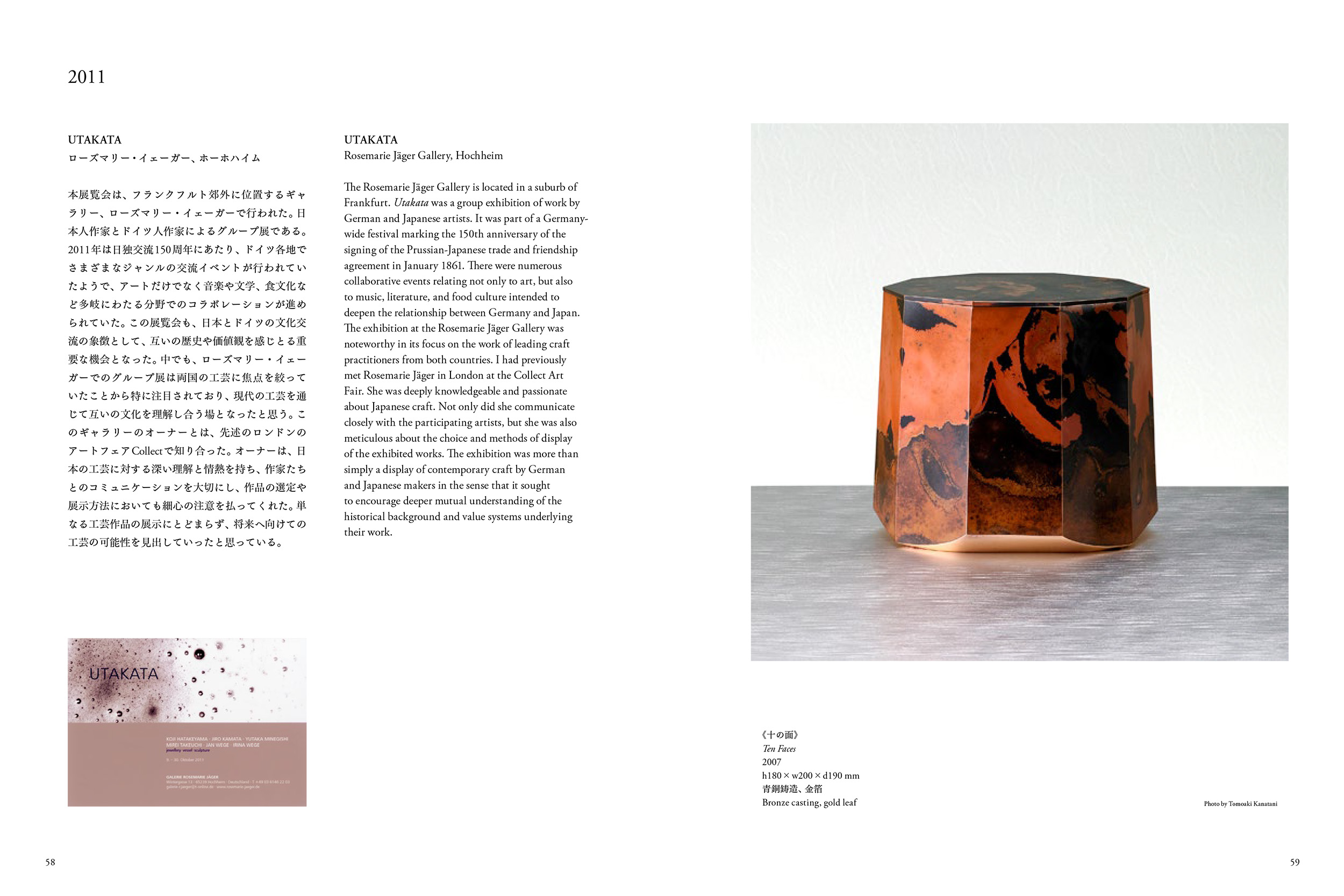 本書は、1985年に工房を設立以来、美術や空間に対して活発な創作活動を続けてきた「金属作家」畠山耕治氏の作品集であり、英国を中心とするヨーロッパ各国での展示の軌跡でもある。常に日本国内に拠点を置きながらも、その創作意識と視線を海外に向けるという姿勢は、作家活動の初期から変わらず強い志として彼が貫いてきたものでもあった。