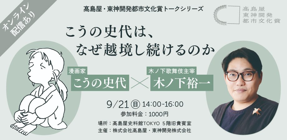 【高島屋・東神開発都市文化賞トークシリーズ】 こうの史代は、なぜ越境し続けるのか -こうの史代 × 木ノ下裕一 2025.08.22 【高島屋・東神開発都市文化賞トークシリーズ】 こうの史代は、なぜ越境し続けるのか -こうの史代 × 木ノ下裕一 開催日時:2025年9月21日(日)14:00〜16:00(13:30開場) 登壇者:こうの史代(漫画家) × 木ノ下裕一(木ノ下歌舞伎主宰) 会場・定員: ◎リアル会場:高島屋史料館TOKYO 5階旧貴賓室・定員35名 ◎オンライン配信:定員100名 《*11月4日(火)23時59分までのアーカイブ視聴が可能》 高島屋史料館TOKYO(東京都)にて、トークイベント「こうの史代は、なぜ越境し続けるのか -こうの史代 × 木ノ下裕一」が開催されます。 イベント詳細・チケットお申し込みはこちら(Peatix)