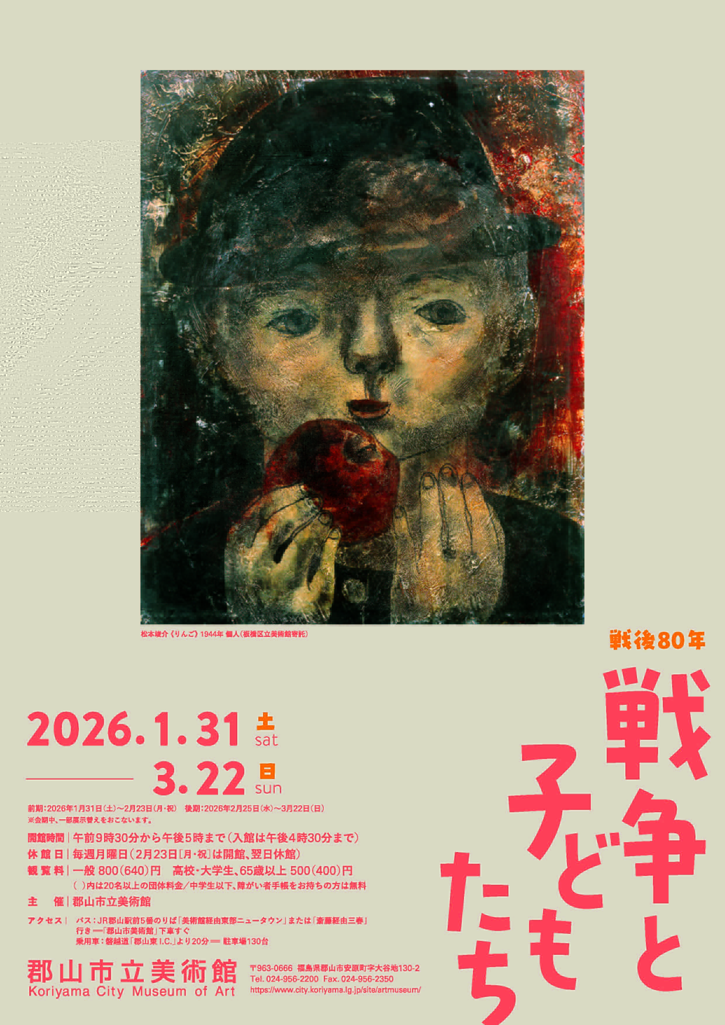 New「戦後80年 戦争と子どもたち」 2026.01.09 「戦後80年 戦争と子どもたち」 開催期間:2026年1月31日(土)~3月22日(日) ※会期中、一部展示替えをおこないます。 前期:1月31日(土)〜2月23日(月・祝)、後期:2月25日(水)~3月22日(日) 開館時間:9:30~17:00(展示室への入場は16:30まで) 休館日:毎週月曜(2月23日(月・祝)は開館、翌日休館) 会場:郡山市立美術館 1階企画展示室 郡山市立美術館(福島県)にて、展覧会「戦後80年 戦争と子どもたち」が開催されます。 展覧会詳細・関連イベント情報はこちら