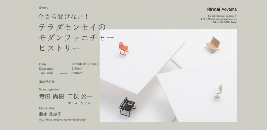 トークイベント「今さら聞けない! テラダセンセイのモダンファニチャーヒストリー」 2026.02.27 トークイベント「今さら聞けない! テラダセンセイのモダンファニチャーヒストリー」 開催日:2026年3月25日(水) タイムテーブル: 17:45 開場 / Rinnai Aoyama 館内ツアー(希望者のみ) 18:30 トーク開始(90分) 20:30 クローズ 登壇者: スピーカー 寺田尚樹、二俣公一(CASE-REAL) モデレーター 藤本美紗子 会場:Rinnai Aoyama Rinnai Aoyama(東京都)にて、トークイベント「今さら聞けない! テラダセンセイのモダンファニチャーヒストリー」が開催されます。 ご希望の方は館内ツアー付きチケットをお申し込みの上、Rinnai Aoyama館内ツアーにもご参加いただけます。 各詳細は下記イベント公式Peatixをご確認ください。 イベント詳細・お申込みはこちら(Peatix)