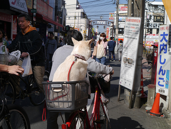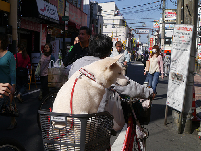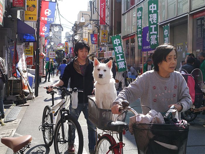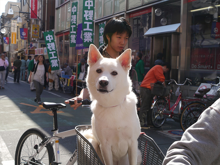 しつこいのが好きなんですよ。こいつ、しつけぇ!!!って半笑いで言われるくらいがちょうどいいですね。しつこくされるのは嫌いですが(笑)。 この犬を発見したときは、なんか大名みたいだなっていうか、後ろのカゴにちょこんと座っておばちゃんが運んでるみたいな。それでなんとなく1 枚撮ったら犬がこっちを見て、なかなか向こうが目線を外さないんで、ずっと撮り続けました。なんか目線を先に外した方が負けみたいな勝負が僕と犬の間で始まったんです。