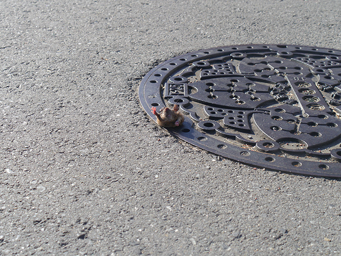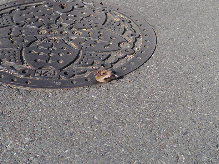 この写真は高田馬場のちょっと路地裏に入ったところなんですけど、最初はタワシが落ちてると思ったんですが、なんかちょっと動いたぞって思って、近づいてよく見るとネズミだったわけです。交差点の真ん中なんですよね。タイヤがここを通るから危ないと思ってすぐに駆け寄って、交通整備をしながら挟まってるのが抜けるまでちゃんと見守ることにしました。見守ったお礼として写真を撮らせていただきました。